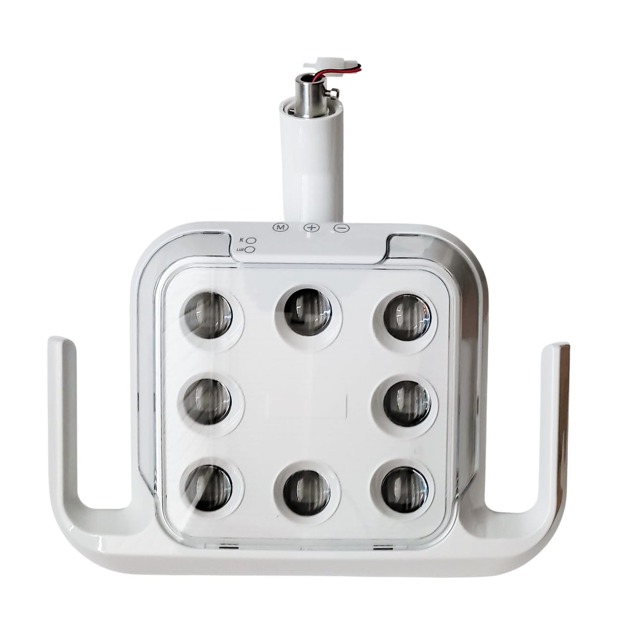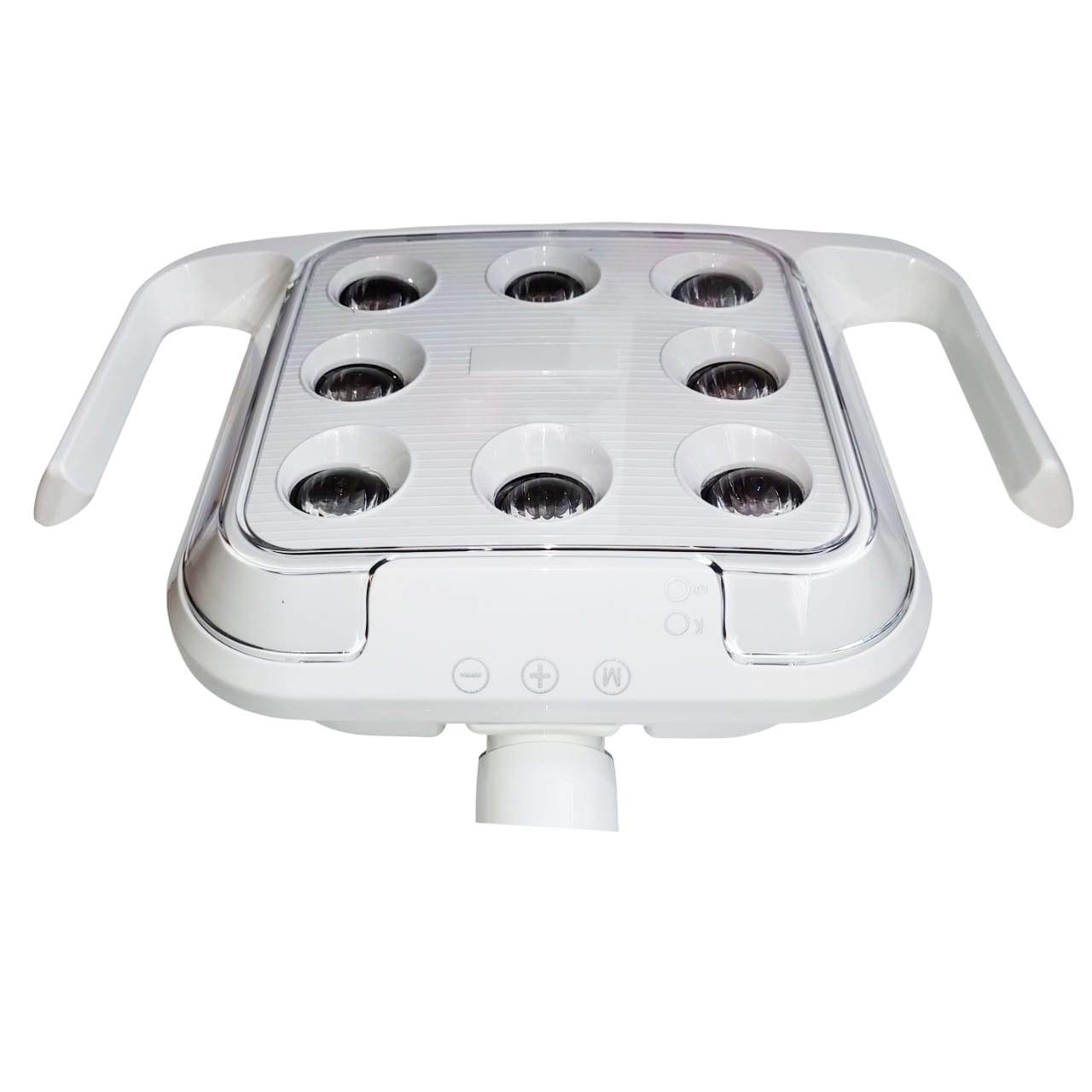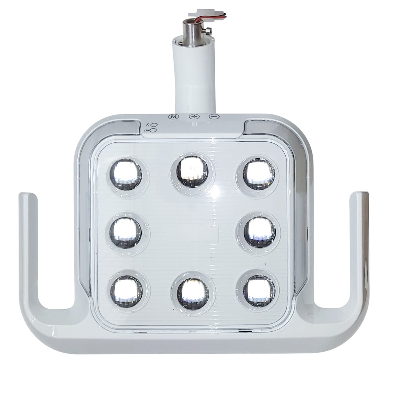 Світильник має компактну прямокутну конструкцію з восьми високоякісних лінзованих LED-модулів, рівномірно розташованих для оптимального розподілу світлового потоку. Таке компонування дає змогу сформувати м’яке, ненапрямлене та комфортне для очей освітлення без різких тіней. Прозоре захисне скло забезпечує захист оптики від пилу й аерозолів, а також легко піддається очищенню та дезінфекції, що є важливим у стоматологічній практиці.