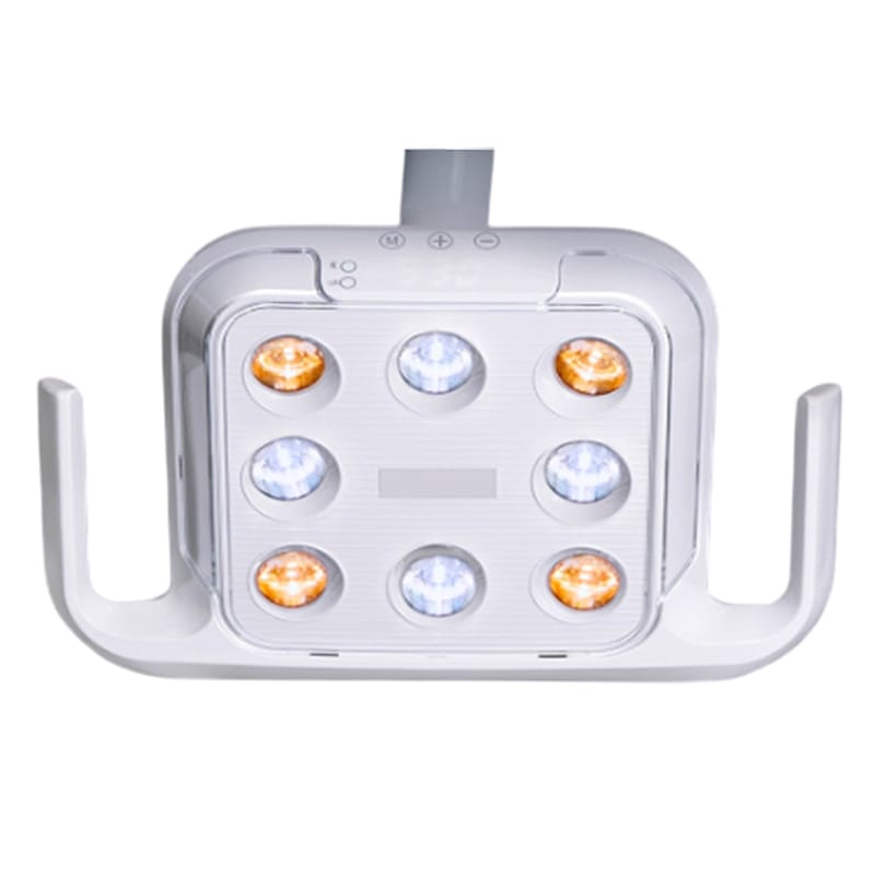 Основною особливістю даного світильника є застосування двокольорових світлодіодів – білого та теплого жовтого випромінювання. Поєднання двох відтінків дозволяє лікарю перемикати або комбінувати світлові режими залежно від клінічної ситуації та типу виконуваної процедури. Біле світло забезпечує високий рівень деталізації, що є особливо важливим під час препарування, діагностики чи роботи з реставраційними матеріалами. Жовтий режим, у свою чергу, зменшує вплив синього спектра на фотополімерні матеріали, запобігаючи їх передчасному затвердінню. Завдяки цьому стоматолог отримує максимальний контроль над умовами освітлення під час роботи.